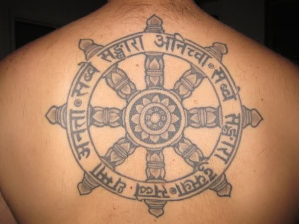 Buddhist tattoos are most commonly designed as the seated buddha with his hands in the form the mudra (dharmachakra) which symbolizes the setting into motion of the wheel of teaching the dharma.